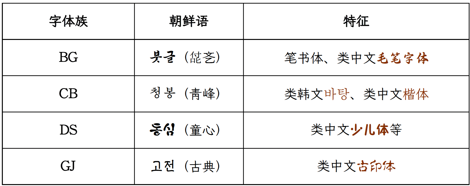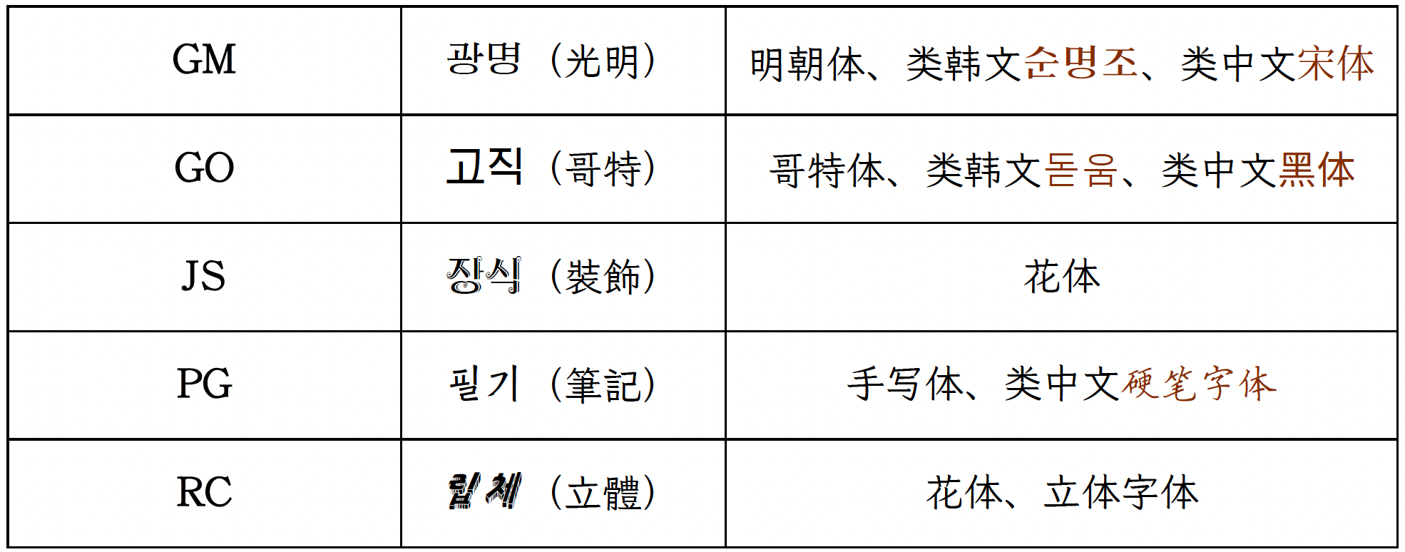 | 英文字体名称 | 朝文字体名称 | 示例 | 文件名 | 分类 |