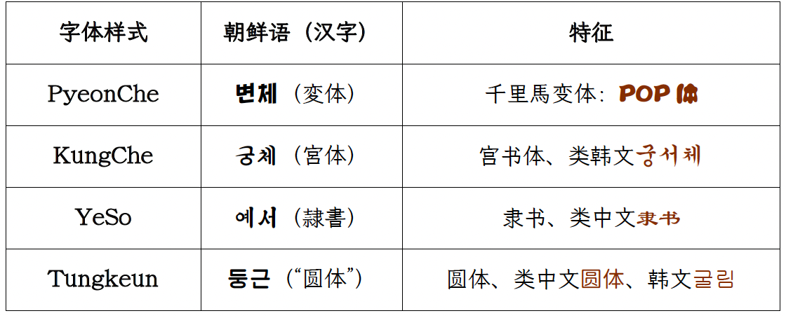 | 英文字体名称 | 朝文字体名称 | 示例 | 文件名 | 分类 |