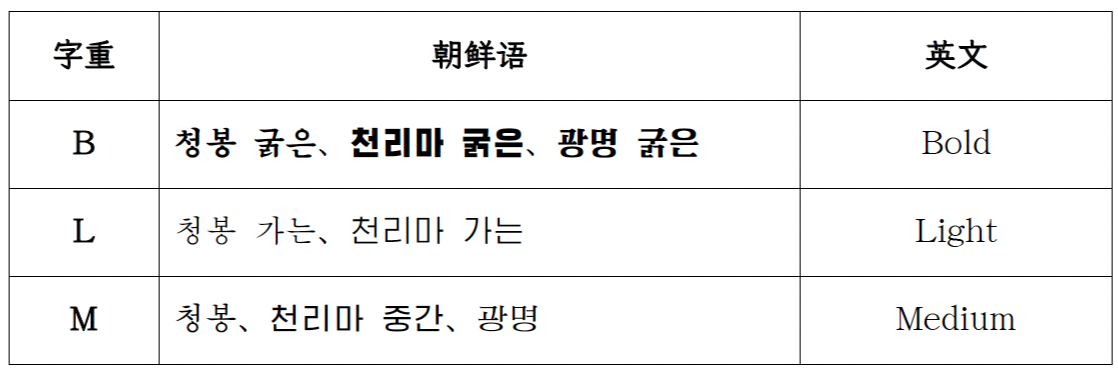 | 英文字体名称 | 朝文字体名称 | 示例 | 文件名 |