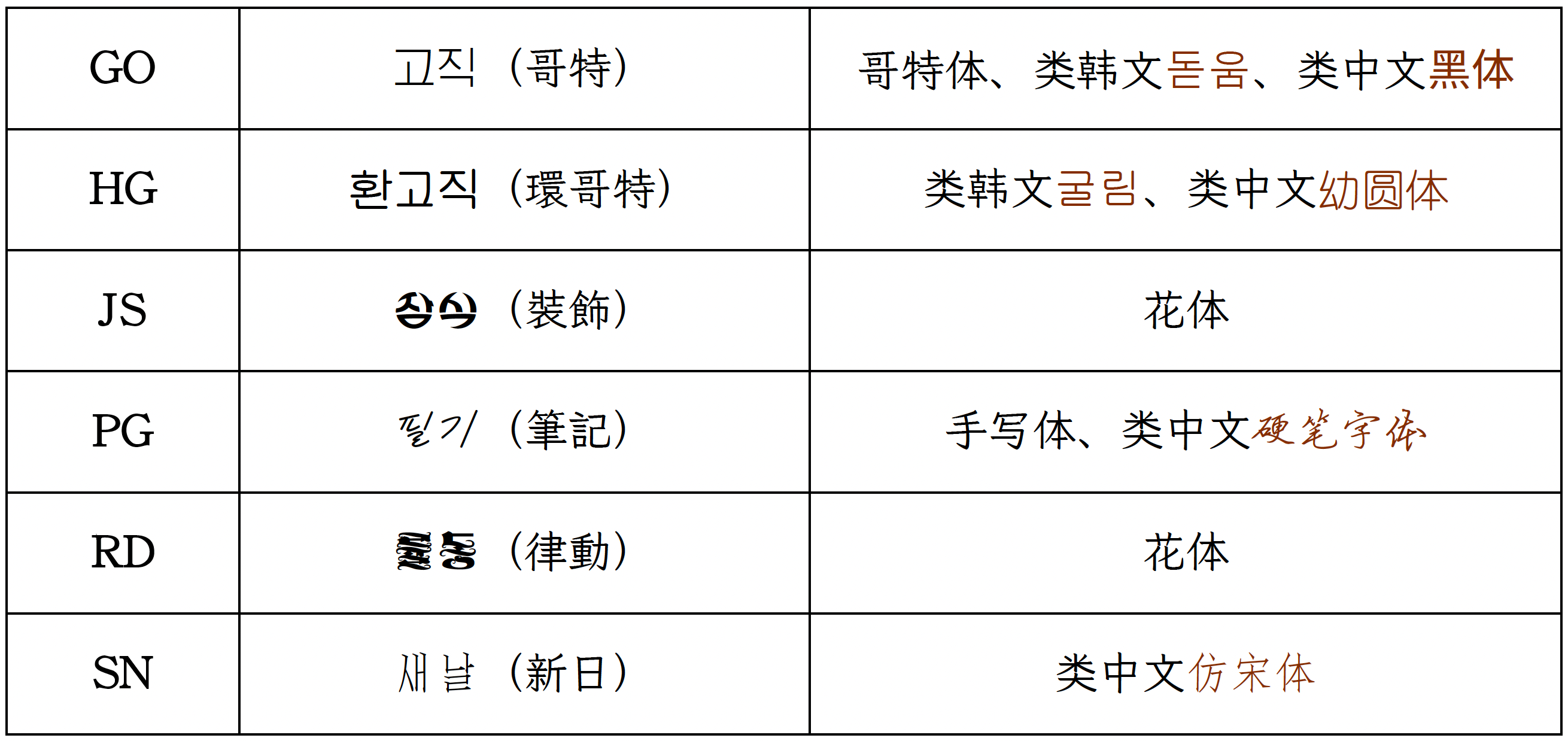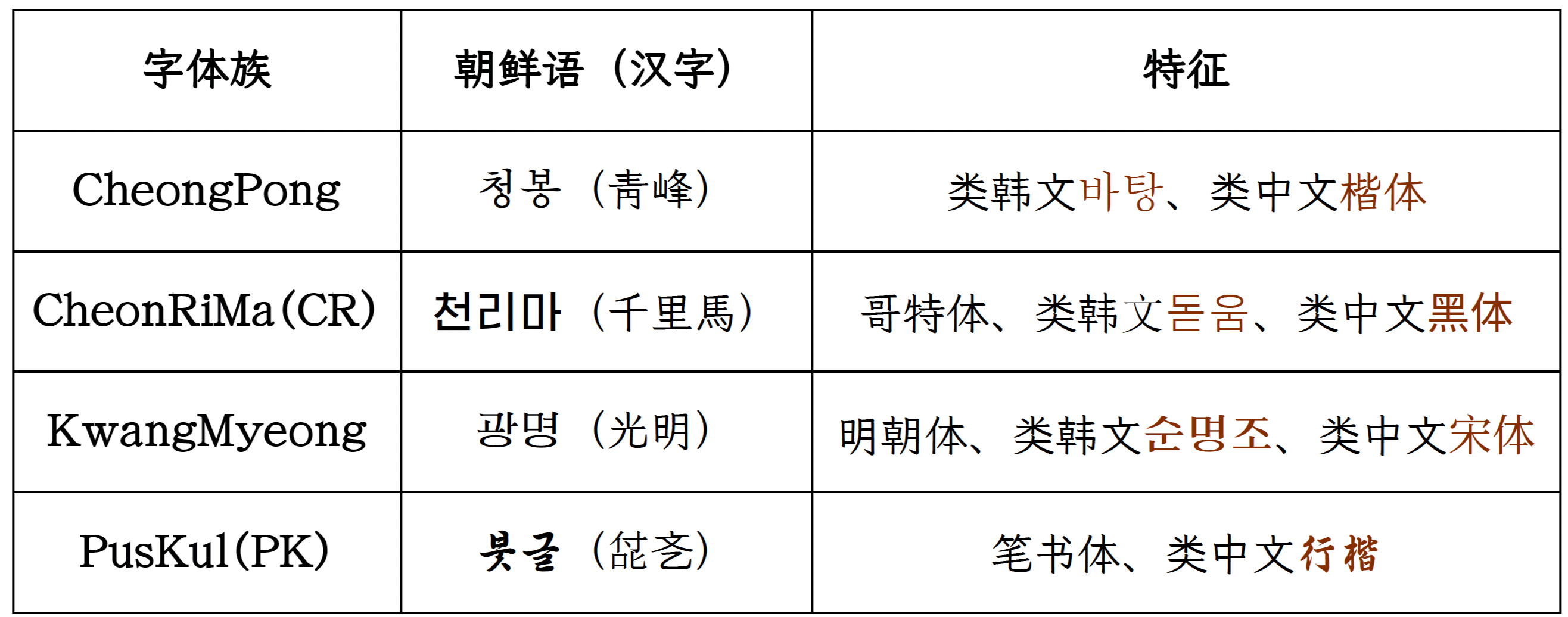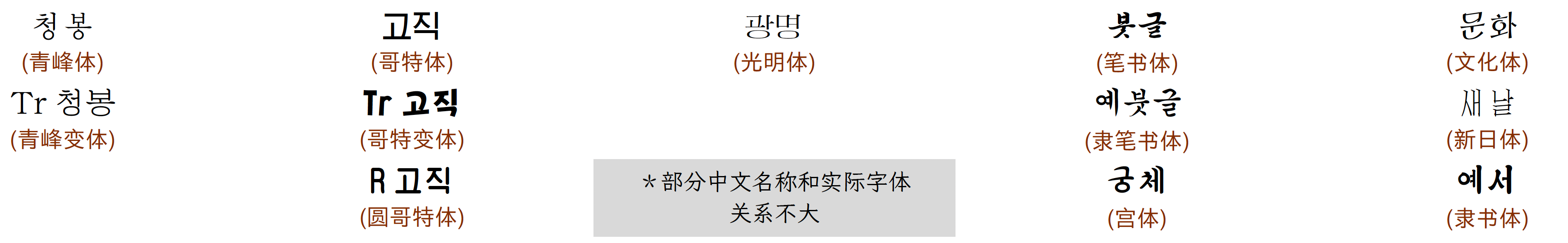 | 英文字体名称 | 朝文字体名称 | 示例 | 文件名 | 分类 |