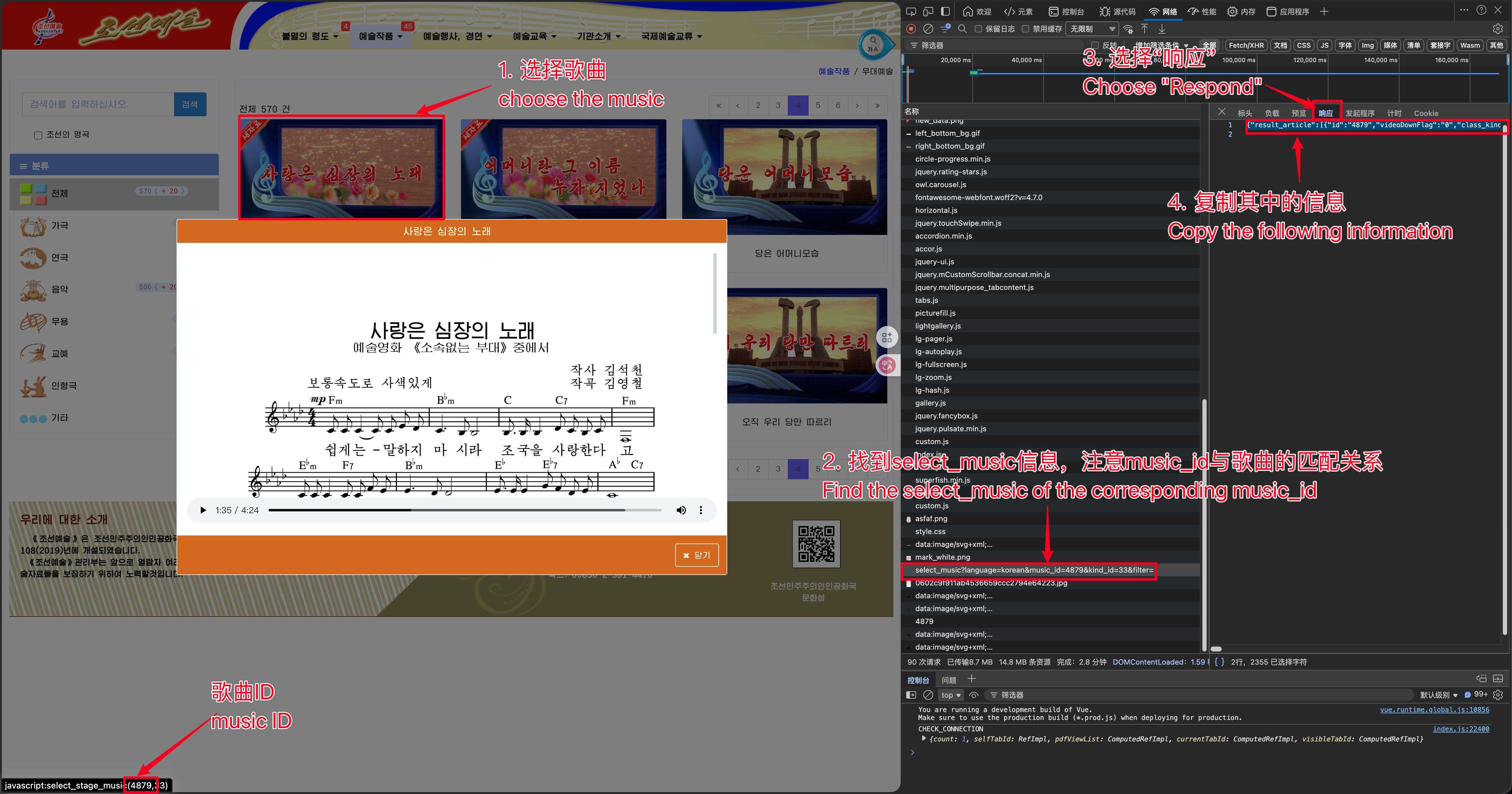 file_path复制到浏览器地址栏,删去其中的反斜杠\,前面加上网站域名http://www.korart.sca.kp/,即相应曲谱图片和音频mp3文件的下载链接。- 例如这里的mp3链接即