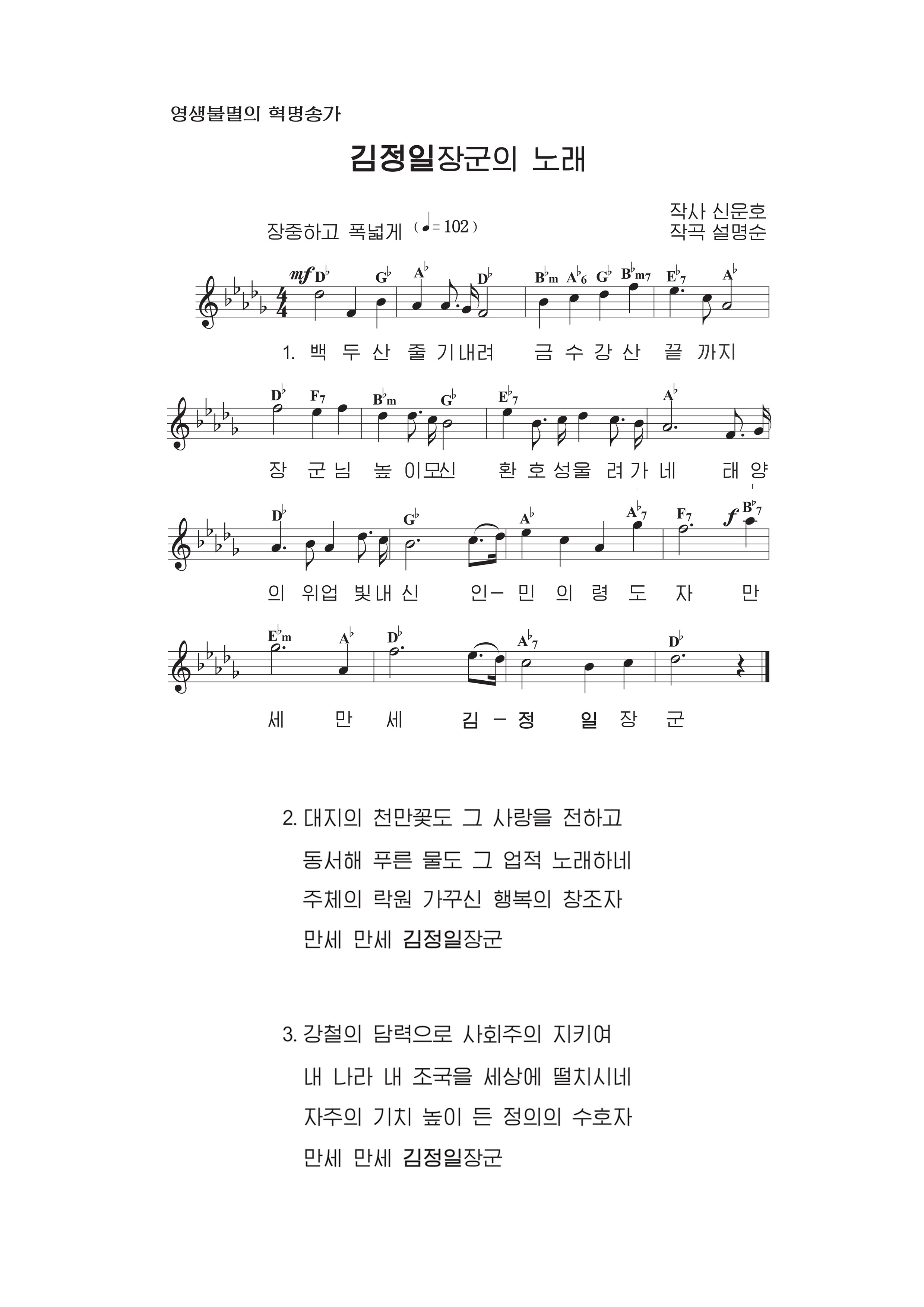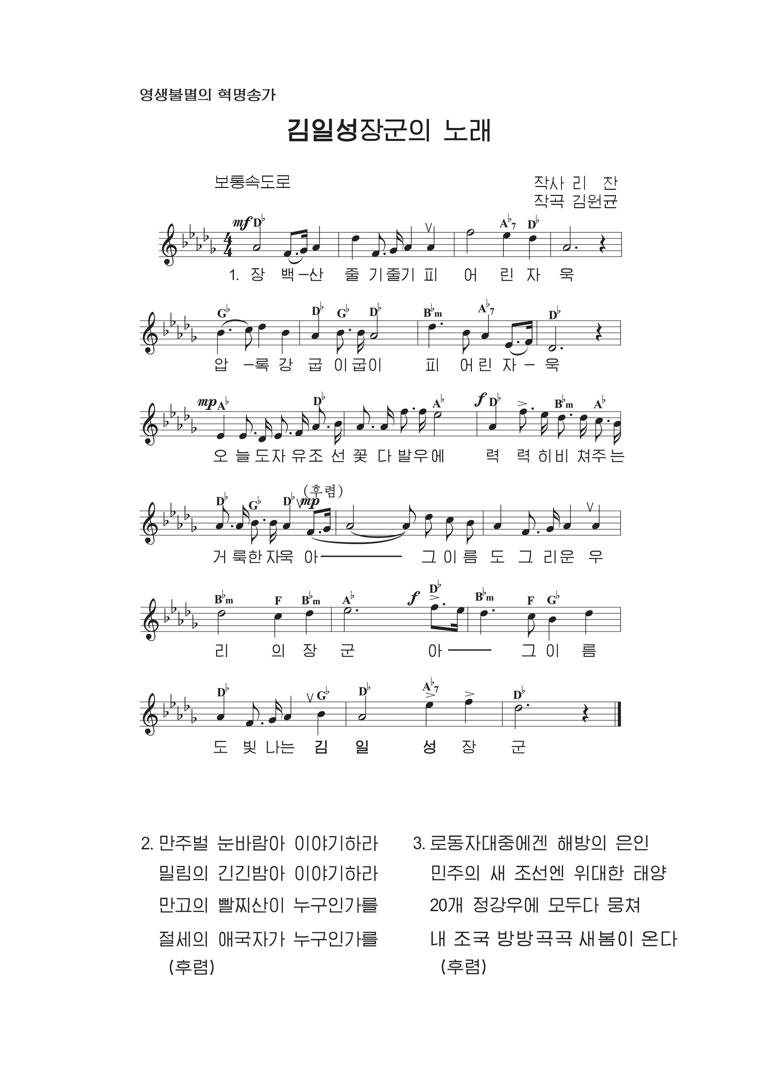 根据 내 나라 网站的相关信息,《金日成将军之歌(김일성장군의 노래)》、《金正日将军之歌(김정일장군의 노래)》也进行了歌词的变更。下图给出了新曲谱的图片。